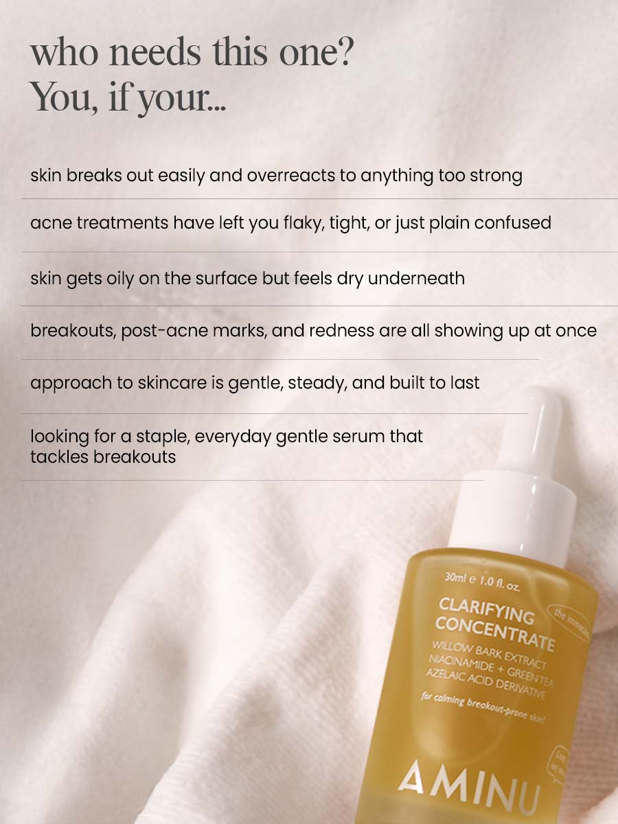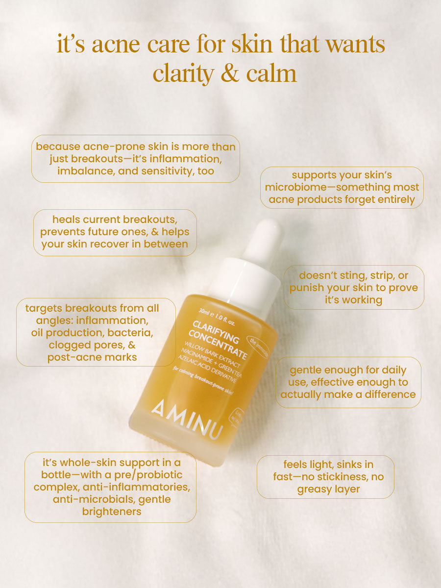 Breakouts don’t need punishment to clear. Clarifying Concentrate is a professional-grade serum that tackles acne at every stage, reducing active breakouts, balancing oil, soothing redness, and helping skin heal post-acne. Powered by ancient herbs, niacinamide, phyto-actives, azelaic acid, amino acids, and hyaluronic acid, it supports barrier health and the microbiome while refining oily, blemish-prone skin. This is clarity with kindness and steady care that improves skin behavior over time.