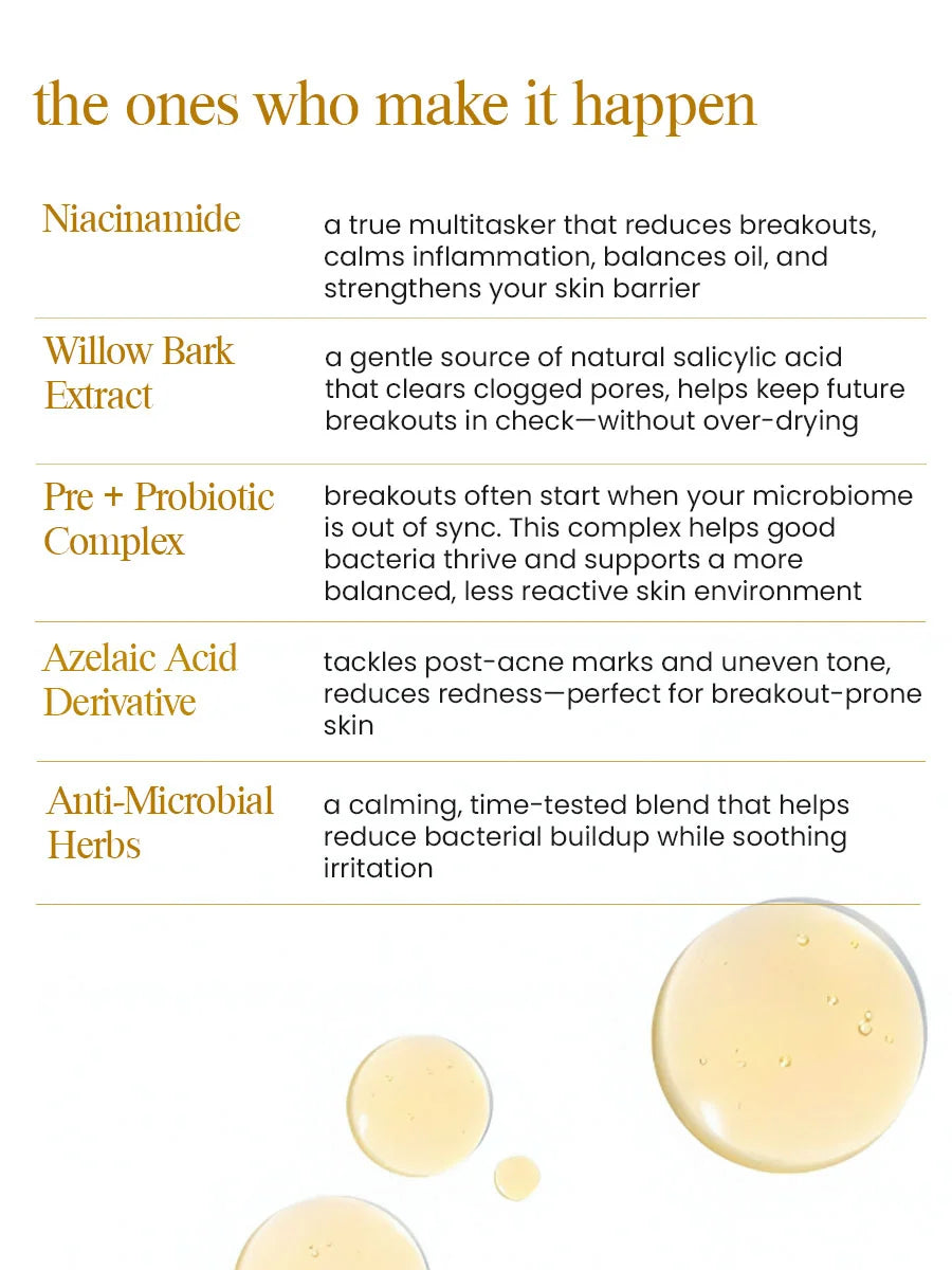 A lightweight, oil-free serum that targets acne and breakouts while keeping skin calm. With niacinamide, willow bark, and probiotics, it balances oil, soothes redness, and supports recovery without stinging, stripping, or harshness. Clearer, calmer skin, day after day.