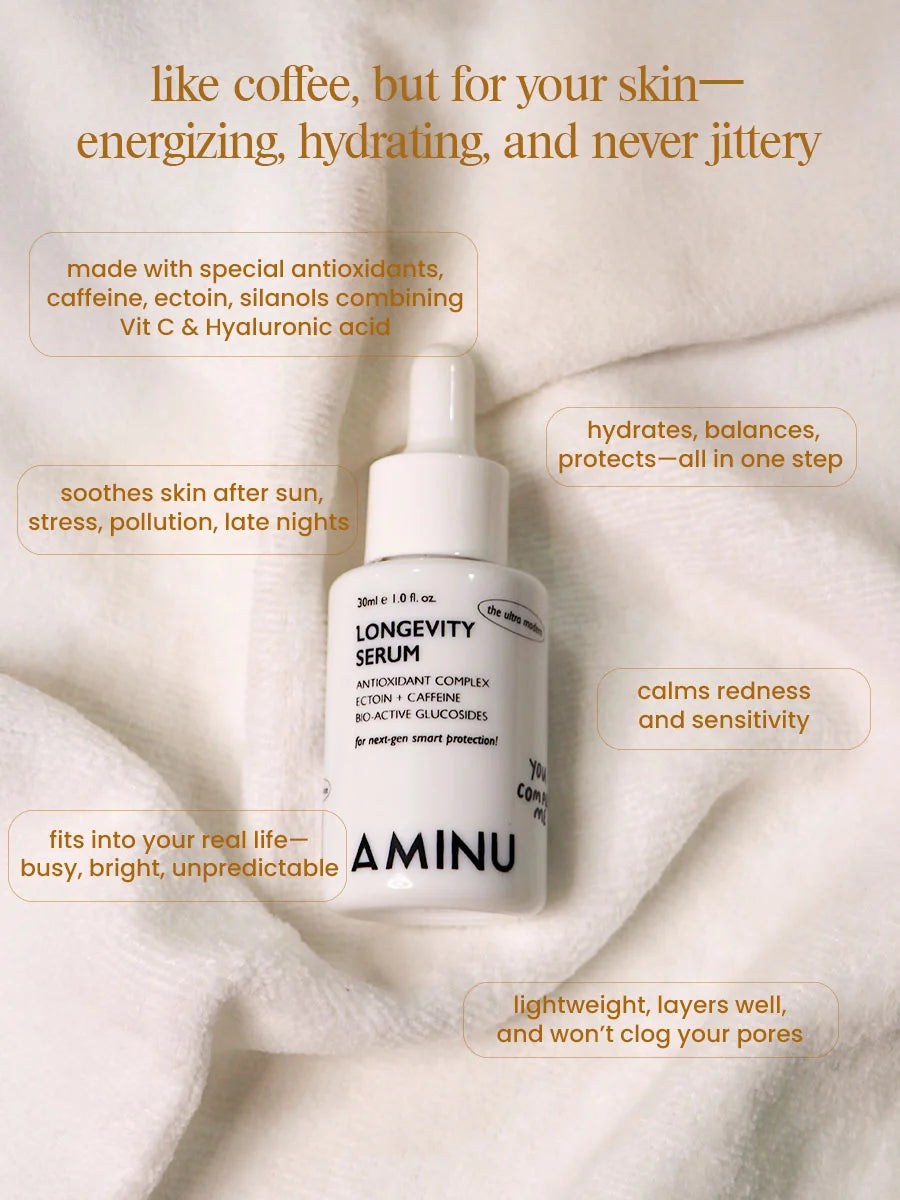 Note - If using retinol and caffeine (Longevity Serum) together, proceed with caution as it may trigger inflammation. Sensitive skin may feel a slight flush due to caffeine.