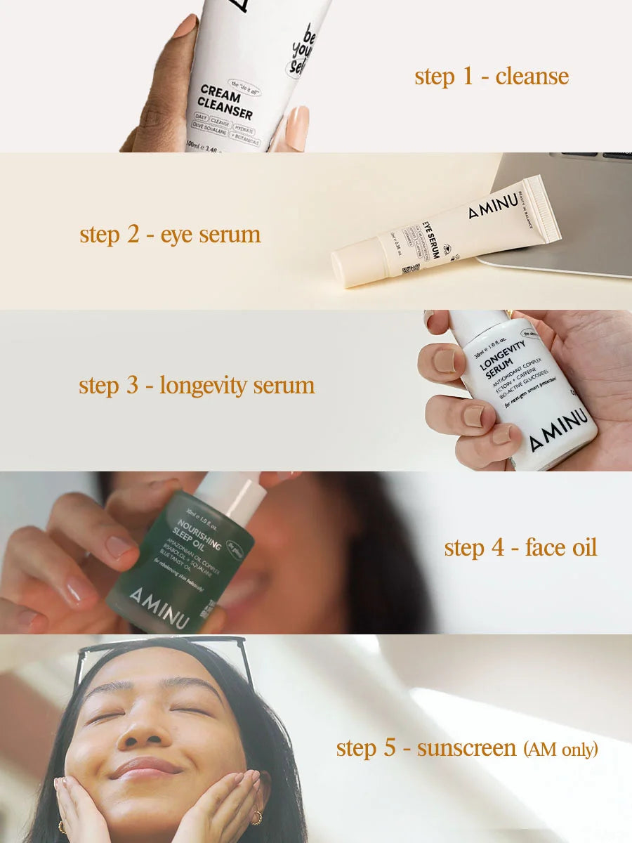 At Aminu, we constantly strive for transparency & be at the forefront of innovation. We are dedicated to maintaining the accuracy of the ingredient lists on this website and on other third-party websites. However, because ingredients and regulatory guidelines are subject to change, for an accurate listing of ingredients, please refer to your product packaging. We will always keep evolving and improving!