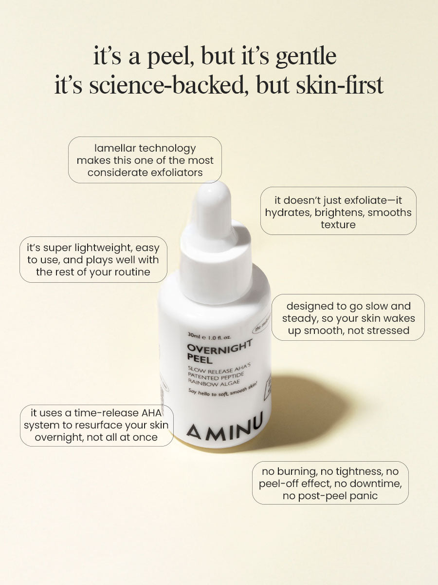 Ever wish your skin could reset overnight? The Overnight Peel is a professional-grade night treatment that unites three gentle acids glycolic, lactic, and citric with brightening algae and a patented peptide. Together, they refine pores, smooth texture, and fade dark spots while supporting your barrier. Its lamellar gel acts as a slow-release reservoir of AHAs, exfoliating and brightening while you sleep for radiant, refreshed skin by morning.