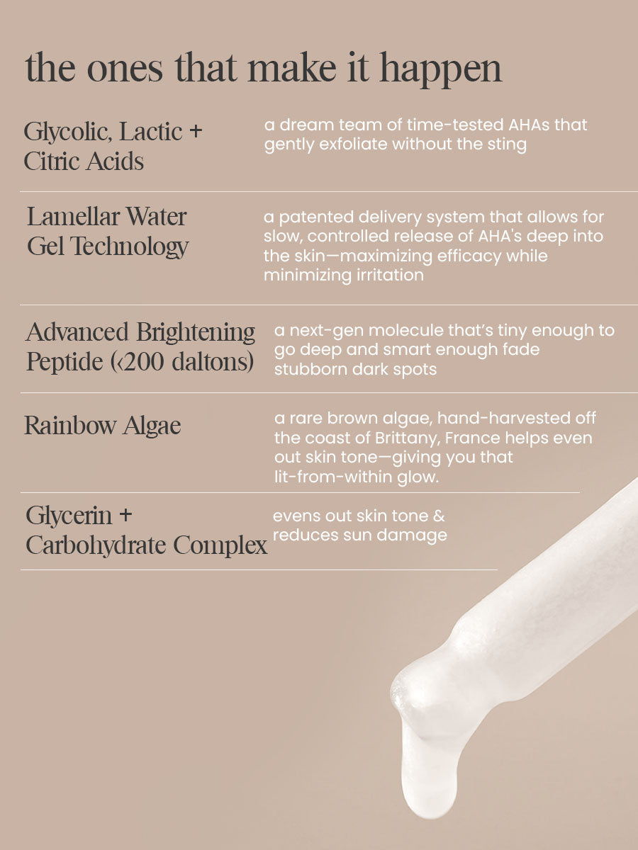A smart water-gel system that releases AHAs slowly, boosting cell renewal, fading spots, and minimizing irritation for smoother results.